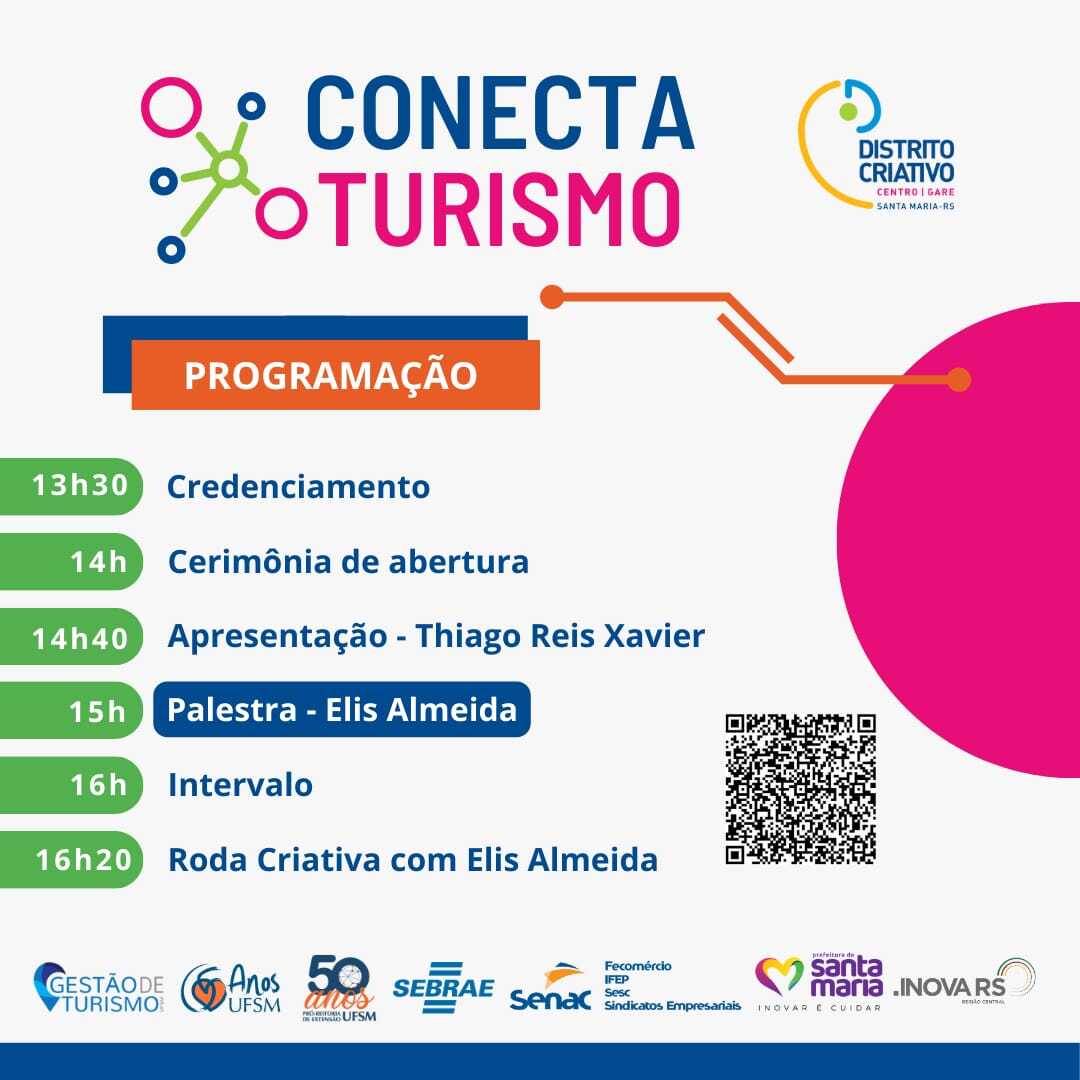 O curso superior de Tecnologia em Gestão de Turismo da UFSM realiza no dia 7 de outubro a 2ª edição do evento Conecta Turismo, que ocorre a partir das 13h30min no Mercado da Vila Belga. Tendo como tema central “Cultura, experiência e pertencimento no Distrito Criativo Centro-Gare”, o evento tem como propósito fortalecer o turismo em Santa Maria, visando à mobilização da comunidade, empreendedores, poder público e instituições em torno de temas como economia criativa, pertencimento, identidade e turismo de experiência.