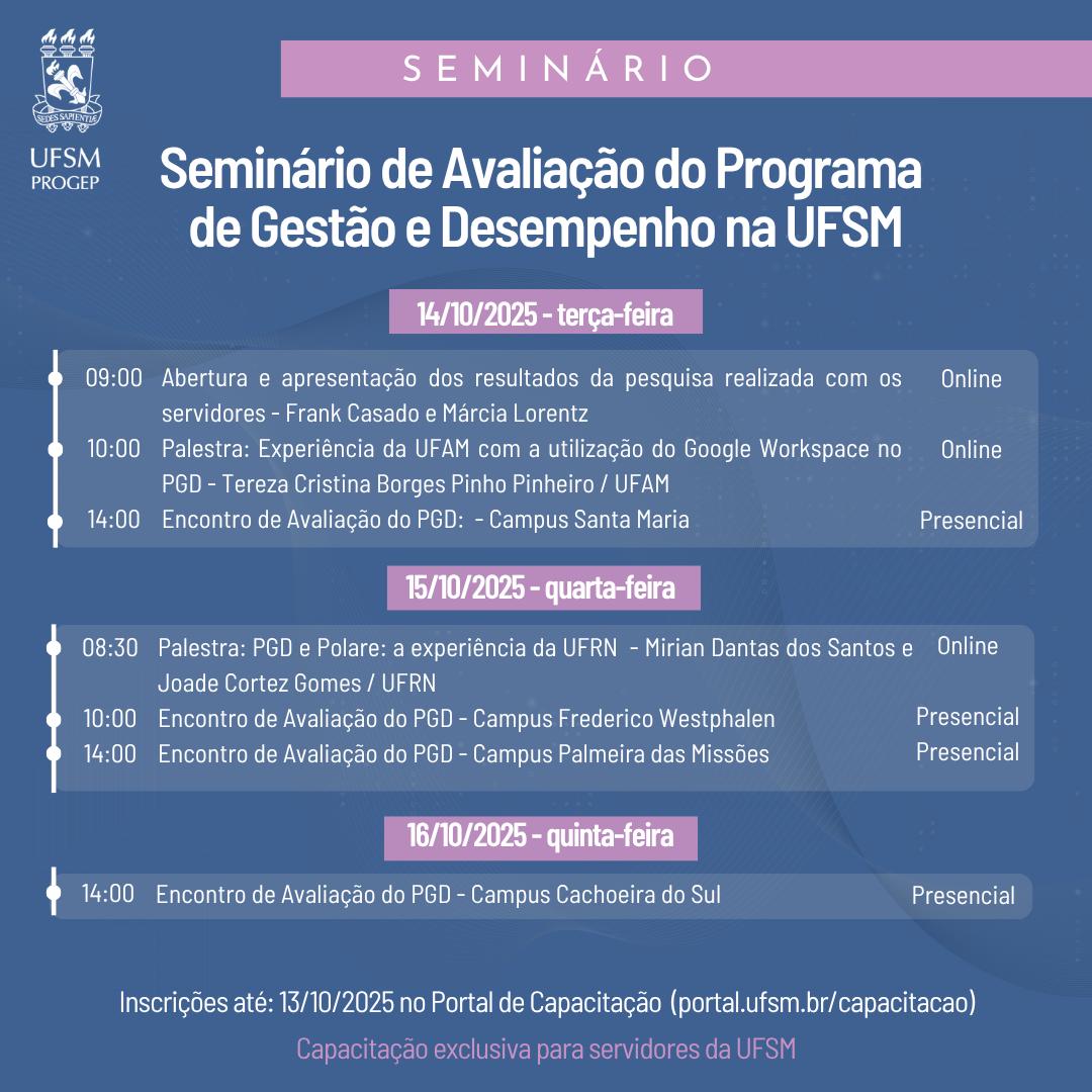 A programação do seminário – que pode ser visualizada na imagem ao lado – inclui atividades on-line, como apresentação de pesquisa sobre o PGD e palestras sobre a implantação do PGD nas universidades federais do Amazonas (Ufam) e do Rio Grande do Norte (UFRN). Haverá também encontros presenciais de avaliação do PGD nos quatro campi da UFSM.