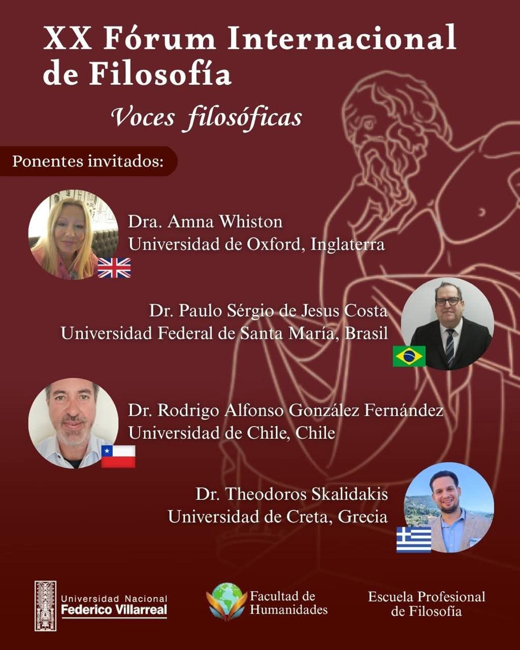 arte vertical colorida com nomes e fotos dos palestrantesO professor Paulo Sérgio de Jesus Costa, do Departamento de Filosofia da UFSM, foi convidado para palestrar no 20º Fórum Internacional de Filosofia, que acontecerá de 18 a 21 de novembro, em Lima, Peru, numa promoção da Escola Profissional de Filosofia da Faculdade de Ciências Humanas da Universidade Nacional Federico Villarreal.