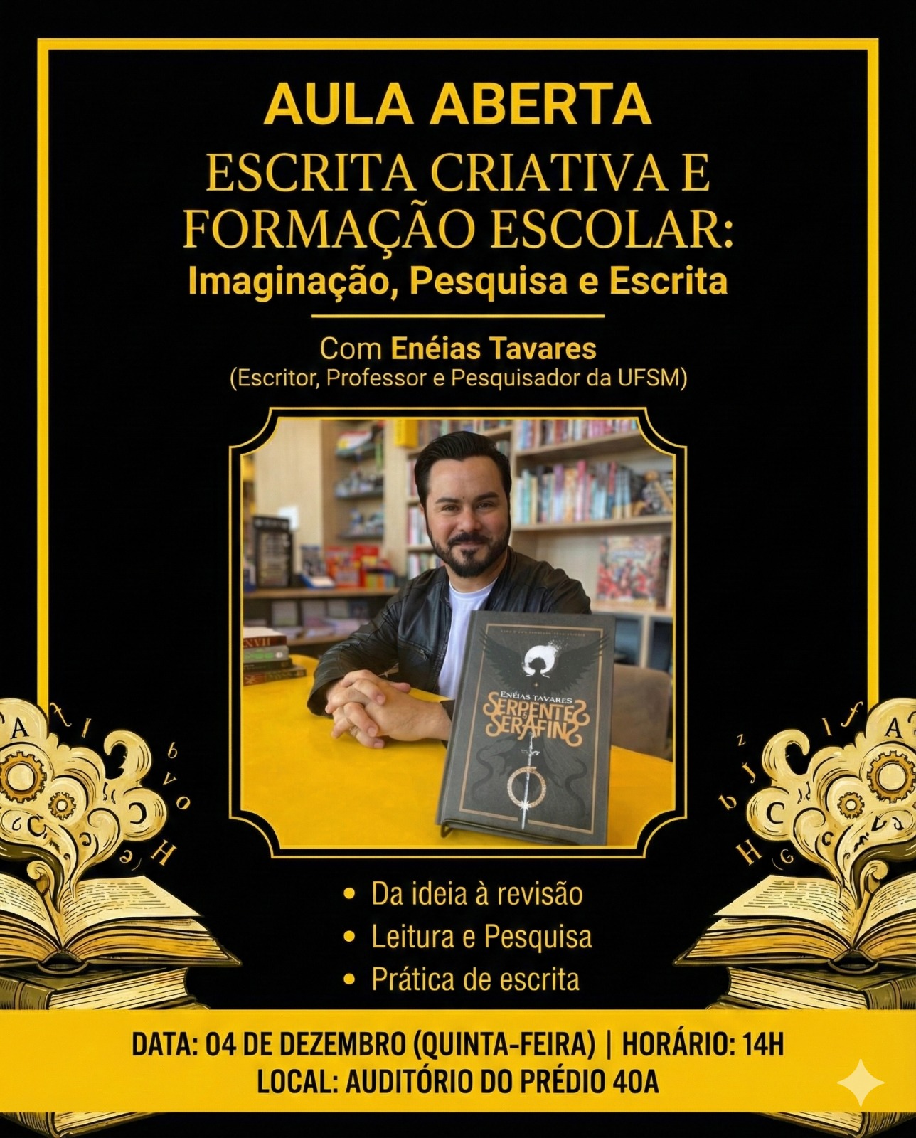 Escritor de literatura fantástica e atual diretor da Editora UFSM, o professor Enéias Tavares vai ministrar nesta quinta-feira (4) uma aula aberta com o tema “Escrita criativa e formação escolar: imaginação, pesquisa e escrita”. Trata-se de uma atividade lúdica e prática sobre os principais elementos que definem o processo criativo de uma história, desde a ideia original, a identificação do gênero narrativo adequado, os desafios da escrita e da reescrita até a revisão de um texto final. O objetivo será a sensibilização dos participantes quanto à importância da leitura e da pesquisa para o processo criativo e para o desenvolvimento profissional. A aula inicia-se às 14h no auditório do prédio 40A do campus sede.