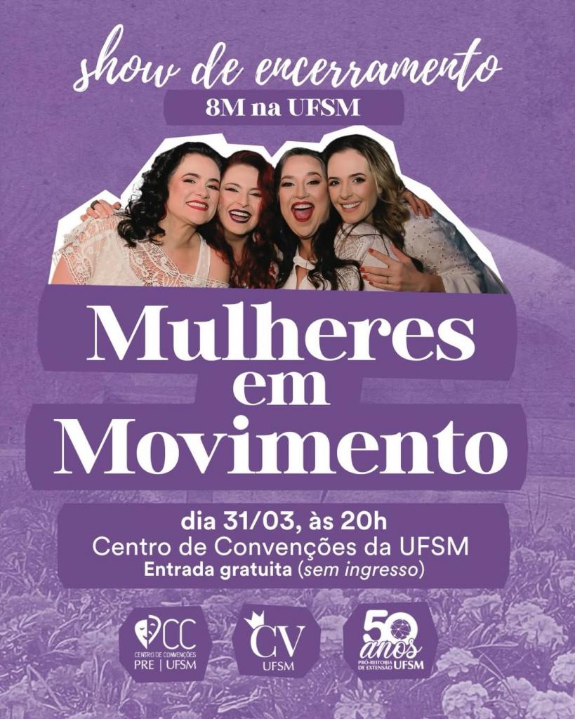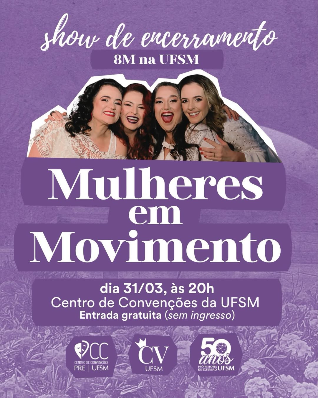A programação especial do mês de março, dedicada à valorização e ao protagonismo feminino, chega ao seu encerramento no dia 31 de março, com a realização do espetáculo “Mulheres em Movimento”. Com entrada gratuita, o show acontece às 20h, no Centro de Convenções da UFSM, reunindo música, emoção e celebração da força feminina na arte.