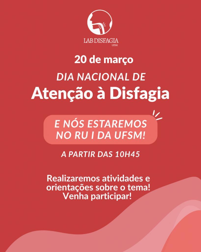 No dia 20 de março, comemora-se o Dia Nacional de Atenção à Disfagia. Em alusão à data, será realizada uma atividade na unidade principal do Restaurante Universitário (RU), das 10h45min às 13h30min. Durante a ação, serão distribuídos folders informativos e oferecidas orientações à comunidade acadêmica sobre a disfagia, condição que se caracteriza pela dificuldade em engolir alimentos, líquidos ou saliva, em qualquer etapa do trajeto da boca ao estômago.