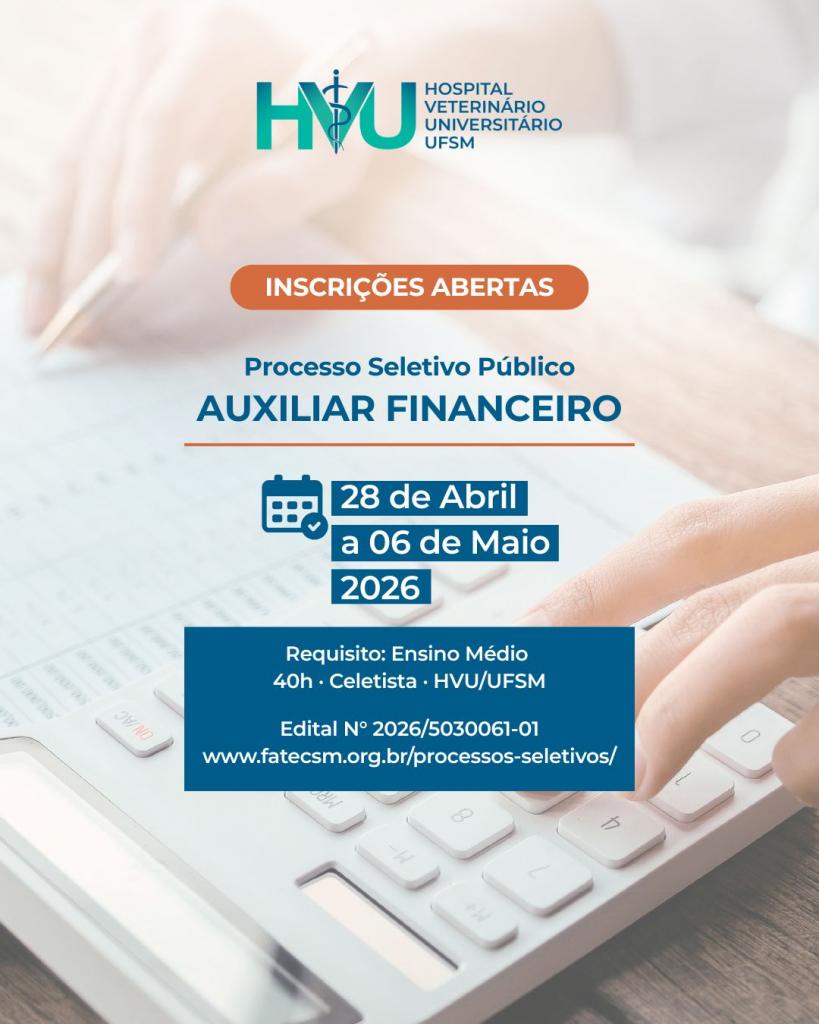 A Fundação de Apoio à Tecnologia e Ciência (Fatec) publicou um edital de seleção para o cargo de auxiliar financeiro, destinada ao Hospital Veterinário Universitário (HVU). Aberto ao público em geral, o processo seletivo é constituído por prova escrita (com questões de português, matemática e raciocínio lógico), entrevista e análise do currículo. Como requisito de qualificação, exige-se o ensino médio completo. Os candidatos devem enviar o currículo no período de 28 de abril a 6 de maio, para o e-mail direcao.hvu@ufsm.br. O salário é de R$ 2.900,00 (mais adicionais), correspondente a uma carga de 40 horas semanais.