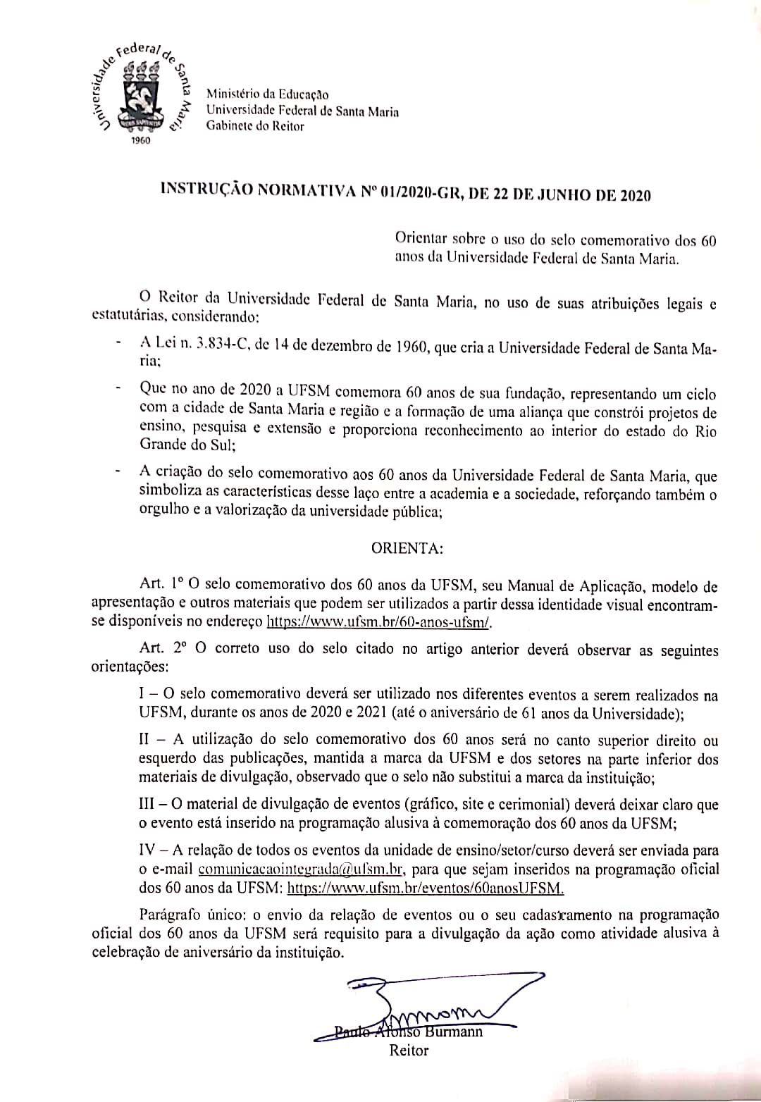 No ano de 2020, a Universidade Federal de Santa Maria comemora 60 anos desde a sua fundação. São 60 anos de um ciclo com a cidade de Santa Maria e região: uma aliança que constrói projetos de ensino, pesquisa e extensão, proporcionando o reconhecimento ao interior do estado do Rio Grande do Sul.