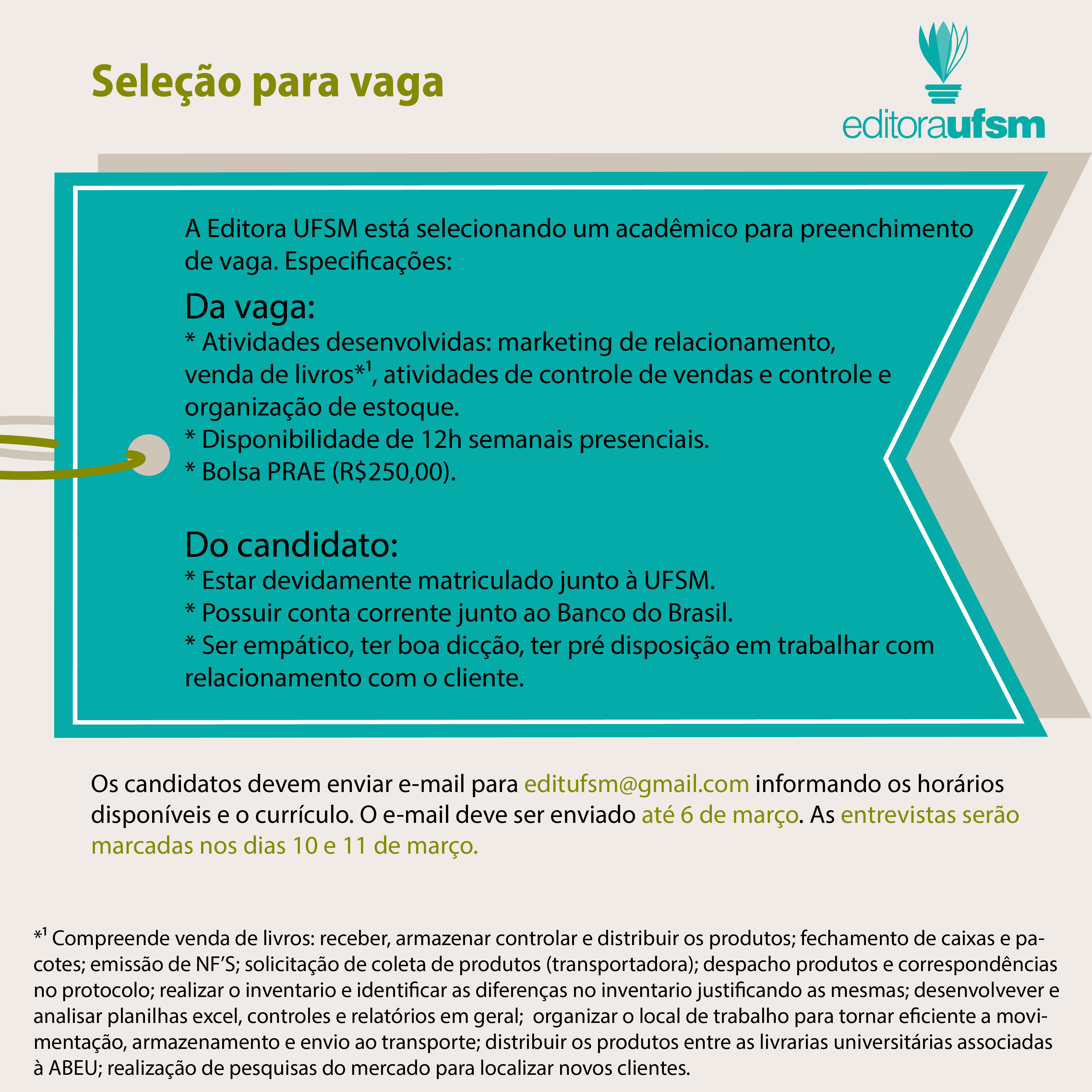 Vaga para bolsista na secretaria do Departamento de Bioquímica e Biologia MolecularO Departamento de Bioquímica e Biologia Molecular dispõe de vaga para bolsista para atuar na secretaria. A bolsa é Prae.Horário de trabalho a combinar (manhã [...]