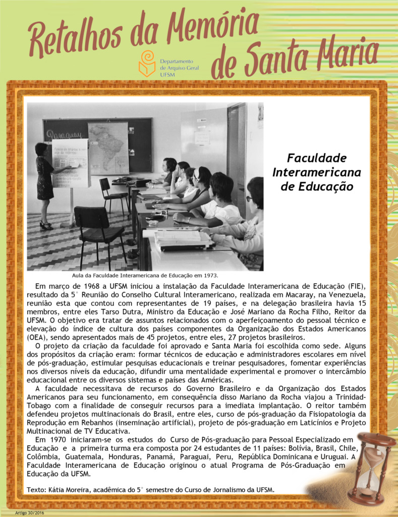 Em março de 1968 a UFSM iniciou a instalação da Faculdade Interamericana de Educação (FIE), resultado da 5° Reunião do Conselho Cultural Interamericano, realizada em Macaray, na Venezuela, reunião esta…