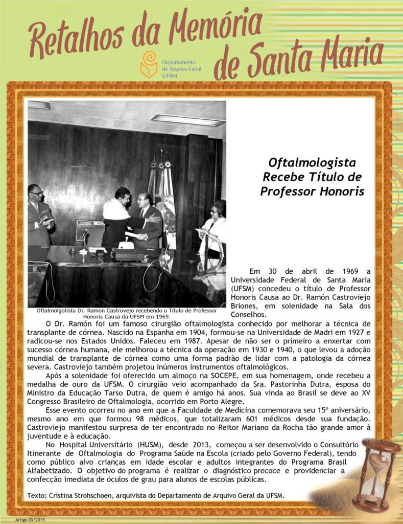 Em 30 de abril de 1969 a Universidade Federal de Santa Maria (UFSM) concedeu o título de Professor Honoris Causa ao Dr. Ramón Castroviejo Briones, em solenidade na Sala dos…