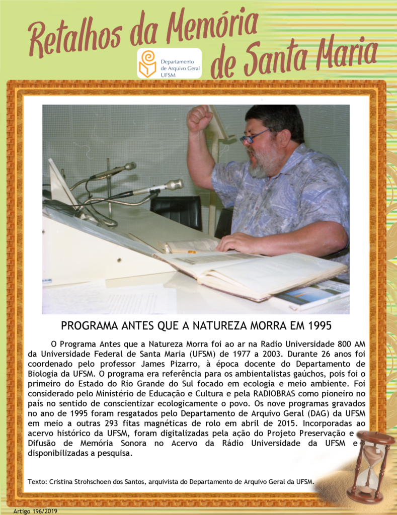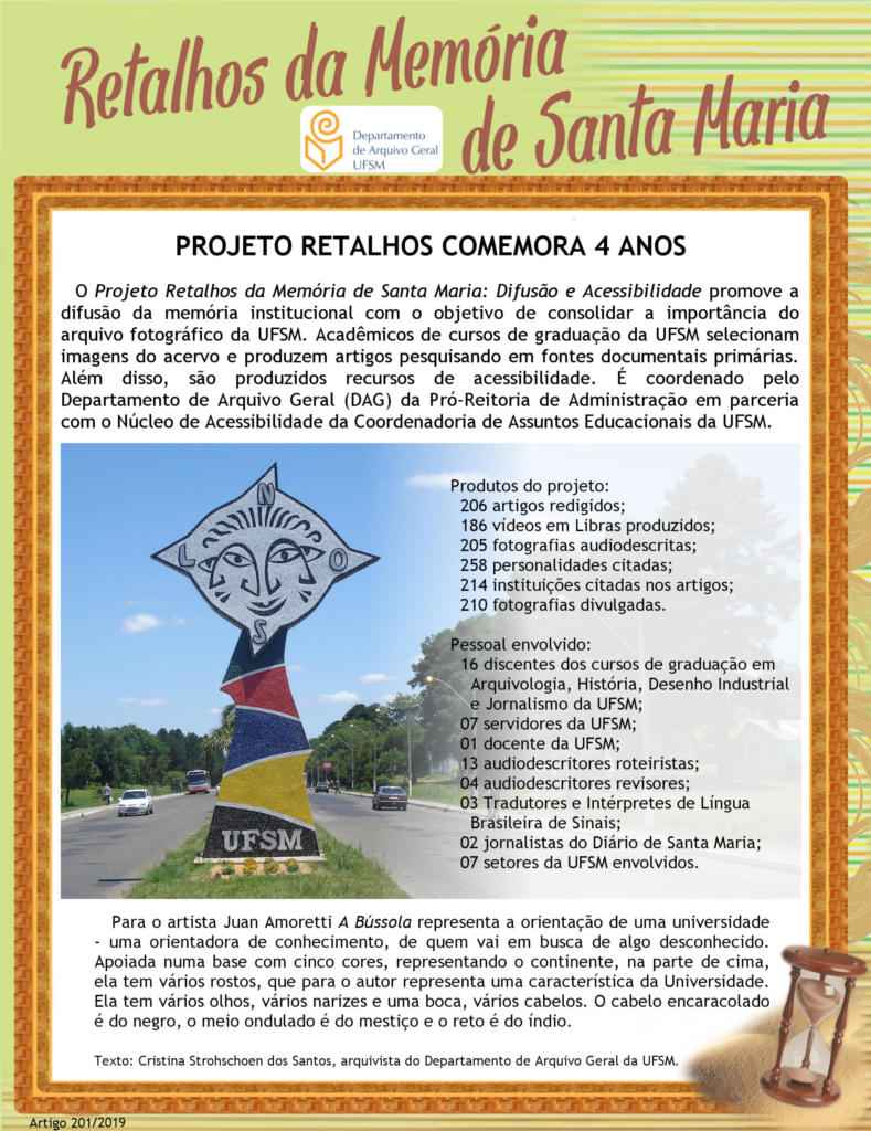 O projeto de extensão “Retalhos da Memória de Santa Maria: Difusão e Acessibilidade”, registro PROPLAN n. 041963 realizou suas atividades sob coordenação do Departamento de Arquivo Geral UFSM em parceria com a Coordenadoria de Ações Educacionais (CAED).