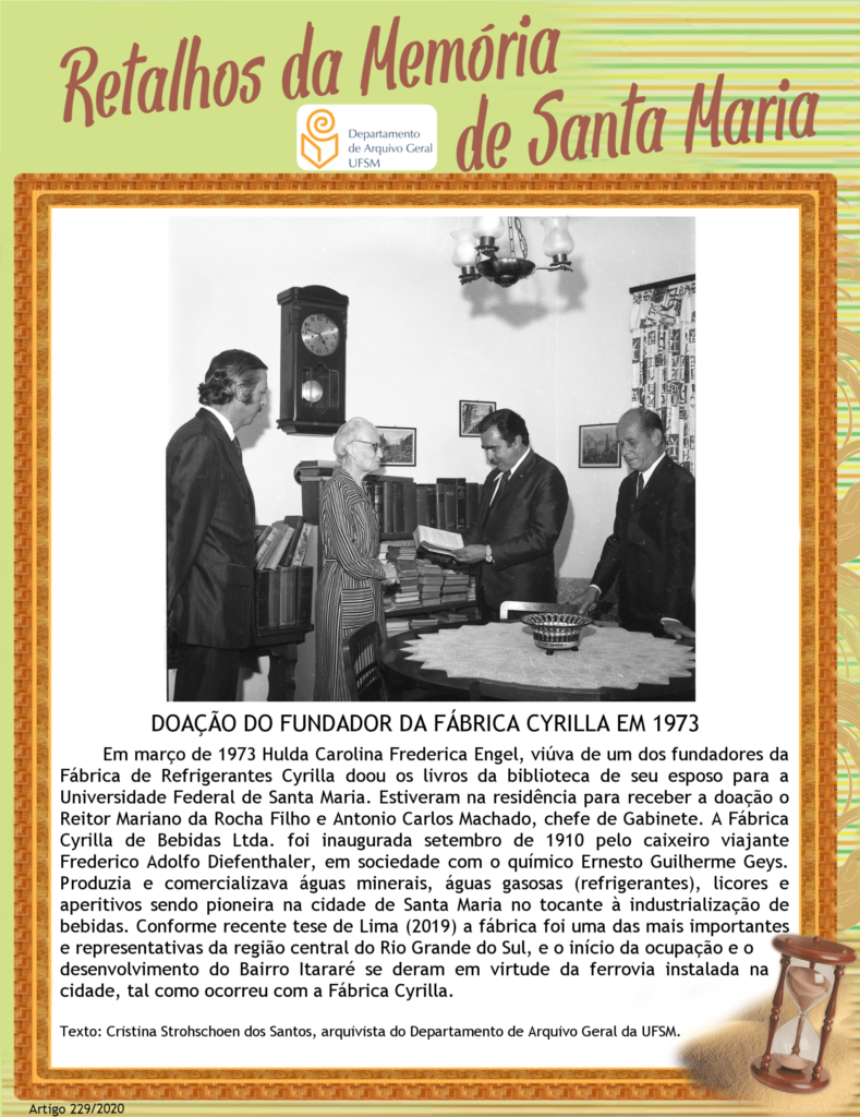 Em março de 1973 Hulda Carolina Frederica Engel, viúva de um dos fundadores da Fábrica de Refrigerantes Cyrilla doou os livros da biblioteca de seu esposo para a Universidade Federal…
