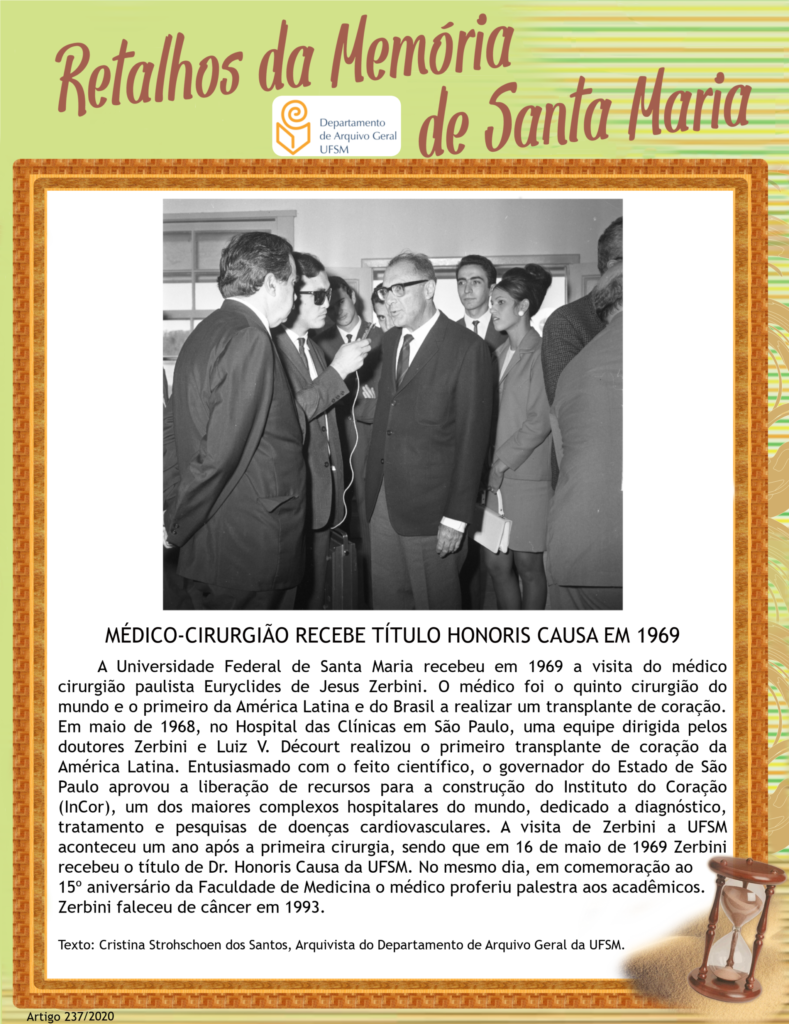 A Universidade Federal de Santa Maria recebeu em 1969 a visita do médico cirurgião paulista Euryclides de Jesus Zerbini. O médico foi o quinto cirurgião do mundo e o primeiro…