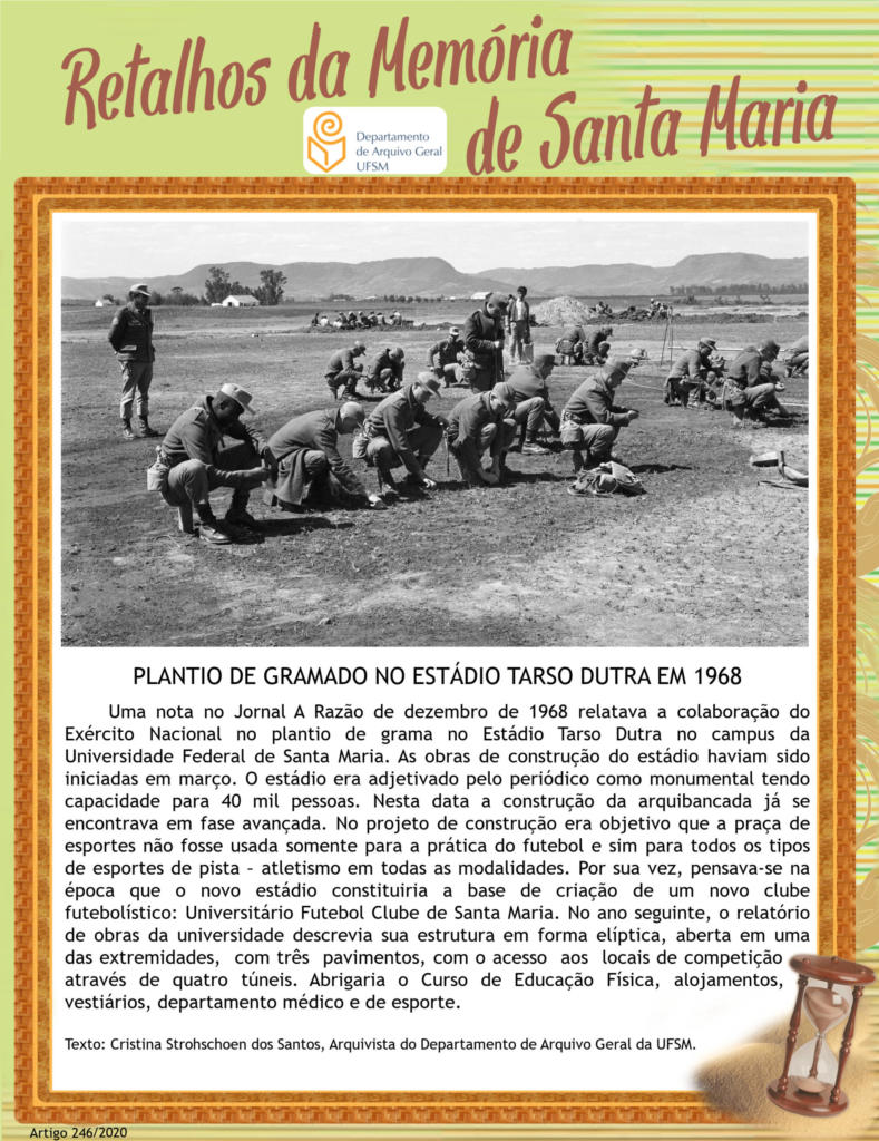 Uma nota no Jornal A Razão de dezembro de 1968 relatava a colaboração do Exército Nacional no plantio de grama no Estádio Tarso Dutra no campus da Universidade Federal de…
