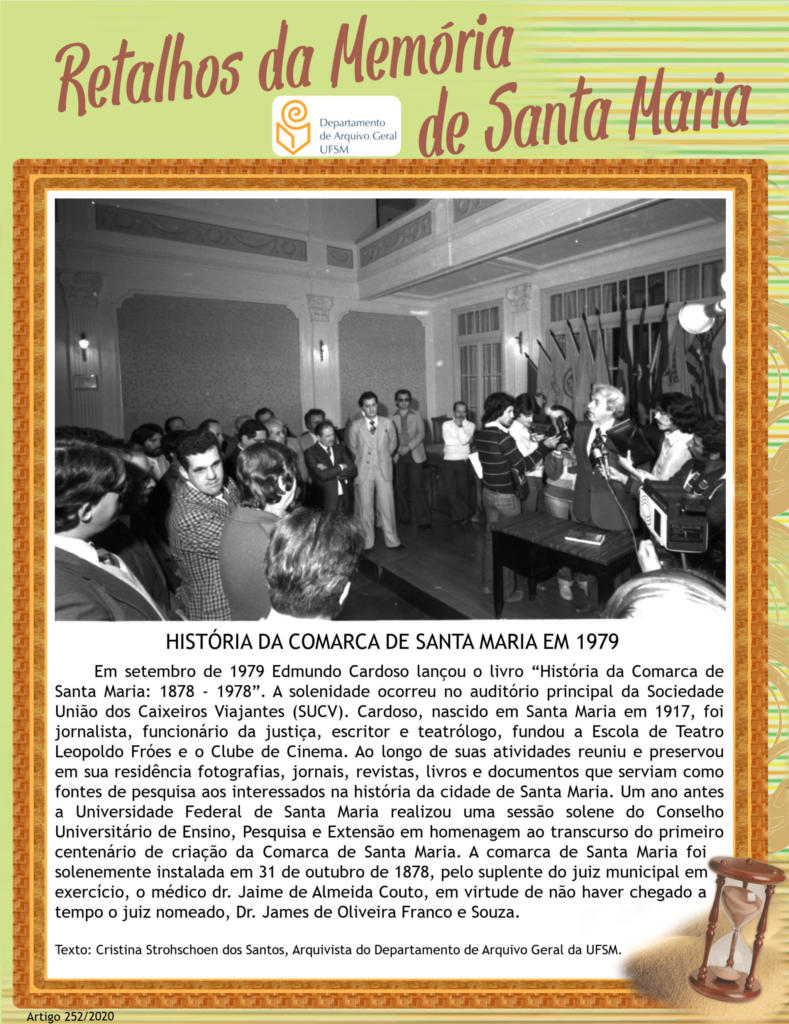 Em setembro de 1979 Edmundo Cardoso lançou o livro “História da Comarca de Santa Maria: 1878 - 1978”. A solenidade ocorreu no auditório principal da Sociedade União dos Caixeiros Viajantes…