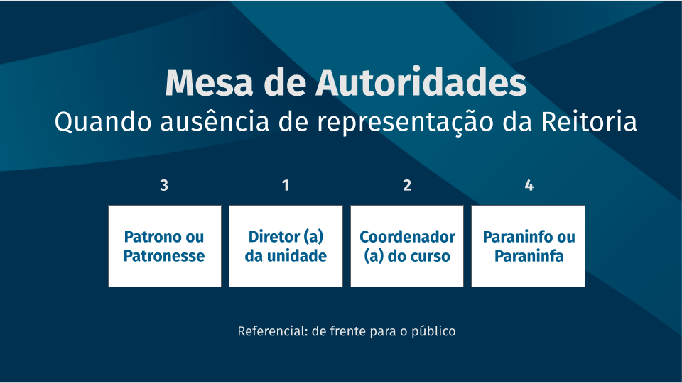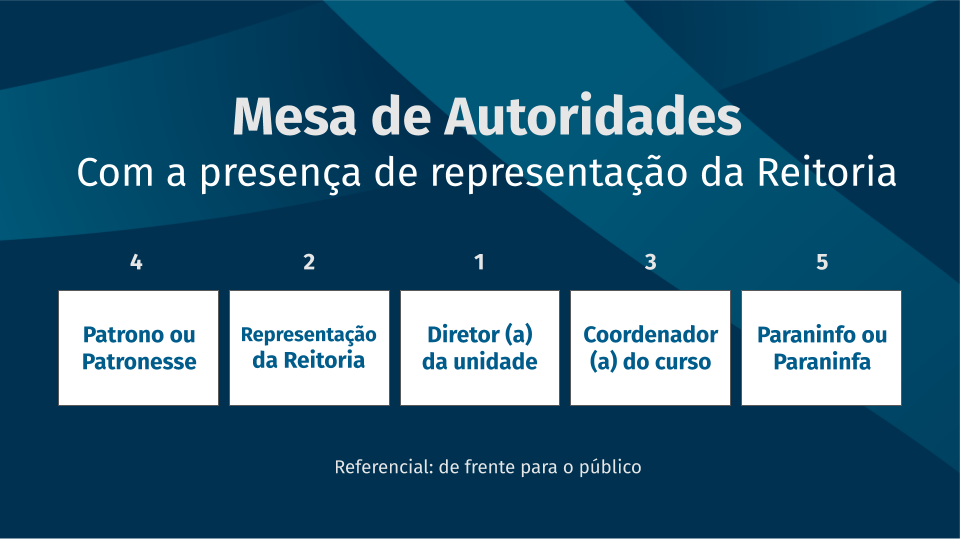 A disposição da ordem das cadeiras na mesa de autoridades dependerá de quais estarão presentes na colação de grau. Abaixo, estão as formações mais frequentes na UFSM.