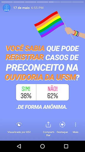 - RELACIONAMENTO COM O PÚBLICO: duas ações feitas nos Stories da UFSM-FW que se encaixam nesse contexto. Lembre-se que as redes sociais são compostas de pessoas e que é possível falar da Universidade e/ou do seu projeto de forma leve e descontraída para chamar a atenção do público e gerar sentimento de pertencimento.