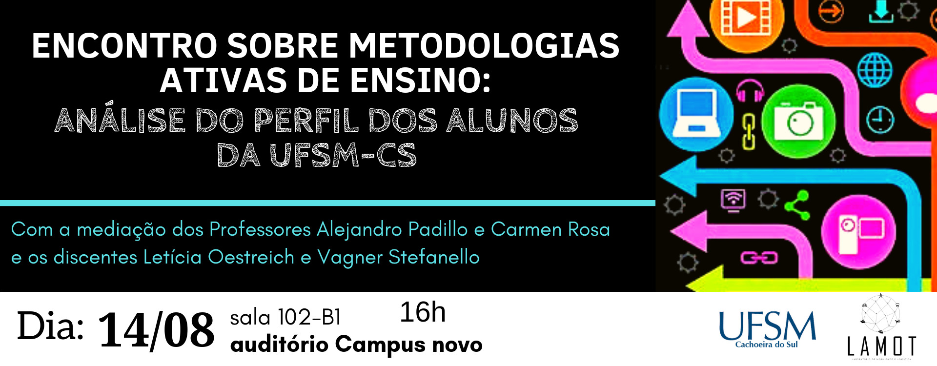 Os integrantes do Projeto de Ensino “Project-based learning – Desenvolvimento de atividades práticas em ambiente lúdico/real/didático” apresentarão o perfil dos acadêmicos do Campus Cachoeira do Sul sob o ponto de vista das metodologias ativas de ensino. Será uma oportunidade para entender melhor o que são essas metodologias e conversar sobre como a análise do perfil dos alunos pode ser aproveitada em sala de aula.