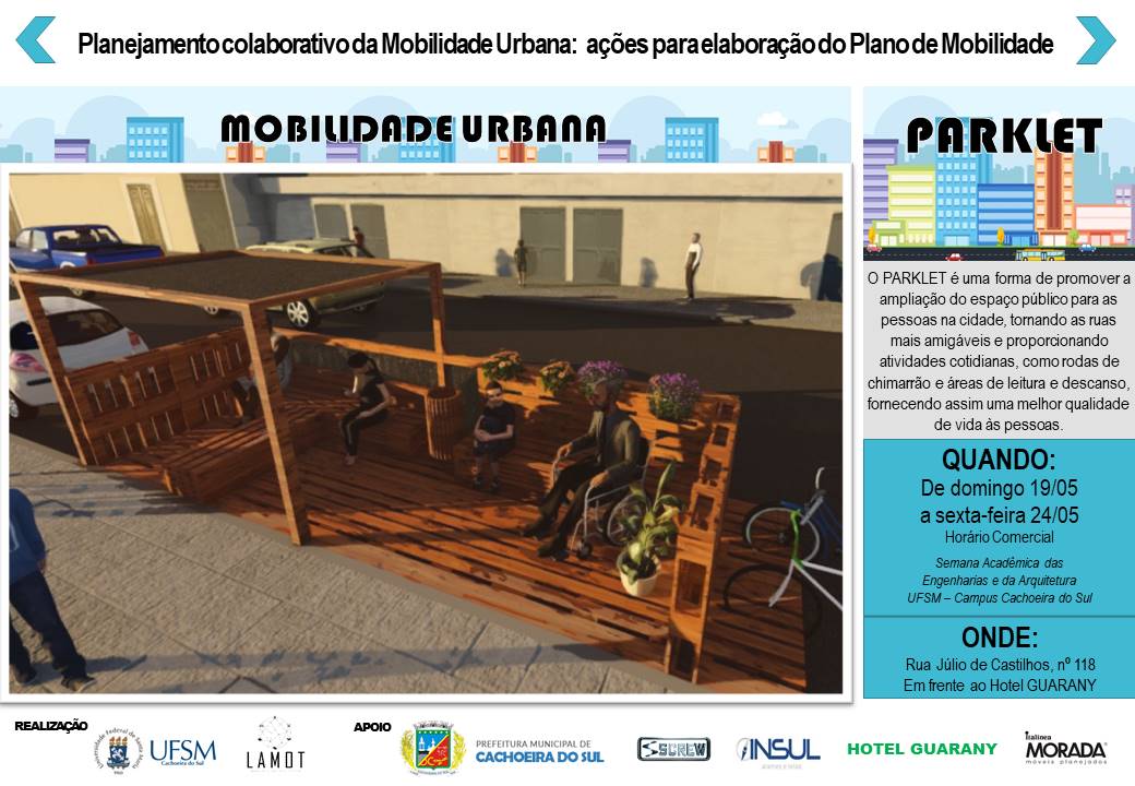 Como mais uma atividade do projeto de extensão “Planejamento colaborativo da mobilidade urbana”, o LAMOT instalará um parklet na Rua Júlio de Castilhos, nº 118, frente ao Hotel Guarany, próximo à Praça Honorato de Cachoeira do Sul, para mostrar a possibilidade de um uso mais “humano” do espaço reservado a estacionamento de veículos. Da mesma forma, serão realizadas ações de conscientização e de divulgação dos princípios de mobilidade sustentável contidas no Plano de Mobilidade Urbana de Cachoeira do Sul.