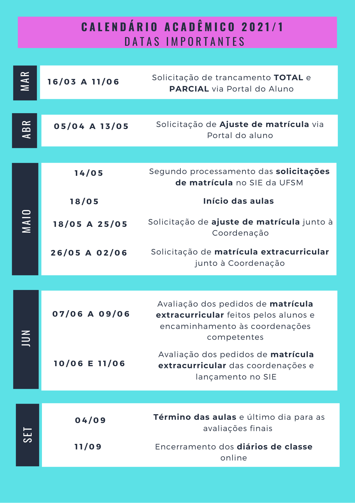 Na última quarta-feira (07/04) o Conselho de Ensino, Pesquisa e Extensão (CEPE) da UFSM aprovou, em reunião extraordinária, alterações referentes ao 1° semestre letivo de 2021, que agora terá início no dia 18 de maio e não mais em 12 de abril. O adiamento deve-se ao alinhamento do início do semestre letivo com a data dos novos ingressantes do Sistema de Seleção Unificada (SISU). O documento na íntegra pode ser acessado através deste link.