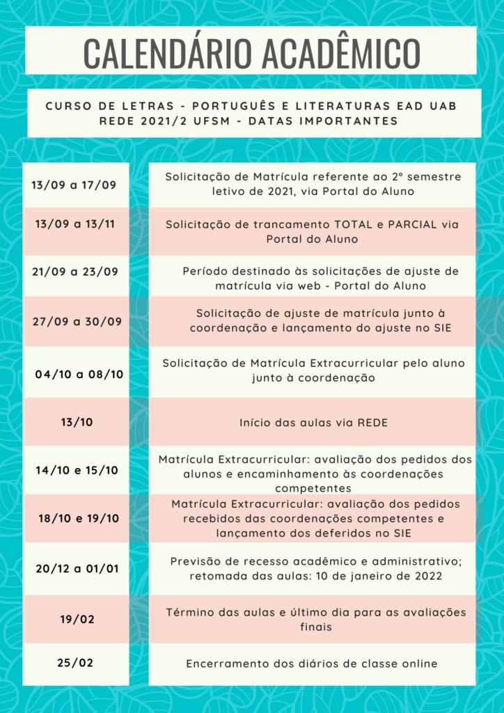 Em reunião realizada pelo Conselho de Ensino, Pesquisa e Extensão – CEPE, no dia 12 de julho, foi aprovado o Calendário Acadêmico da UFSM previsto para o segundo semestre letivo de 2021. As atividades acadêmicas, tal como no semestre anterior, serão realizadas via Regime de Exercícios Domiciliares Especiais – REDE, e terão início no dia 13 de outubro de 2021. O encerramento do semestre será no dia 19 de fevereiro de 2022. O resumo com as principais datas referentes ao calendário pode ser conferido abaixo. Já o Calendário Acadêmico na íntegra pode ser acessado através deste link.
