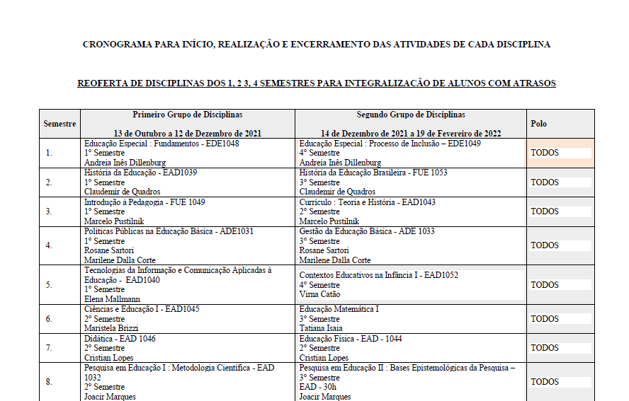 Informamos também que as disciplinas da reoferta serão ofertadas em dois grupos, com início em datas distintas: