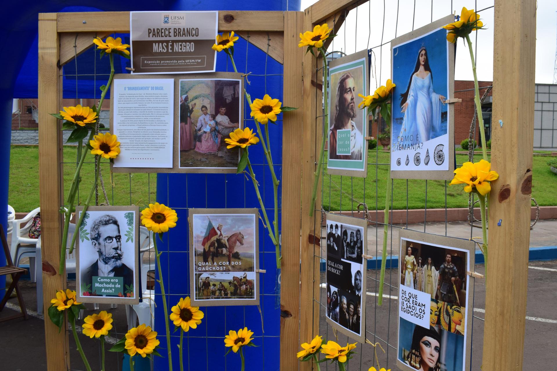 A UFSM/FW apresentou no evento a exposição “Parece branco, mas é negro”, promovida pelo Núcleo de Assistência Estudantil e inspirada em uma atividade desenvolvida pelo NEABI IFRS Ibirubá. A mostra busca desmascarar o processo de embranquecimento de grandes figuras históricas, como Machado de Assis, Cleópatra, Yemanjá, Jesus Cristo, entre outras.