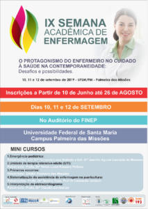 De 10 a 12 de setembro será realizada a 9ª Semana Acadêmica do curso de Enfermagem da Universidade Federal de Santa Maria, campus Palmeira das Missões. O evento deste ano terá como tema “O Protagonismo do Enfermeiro no Cuidado à Saúde na Contemporaneidade: Desafios e Possibilidades” e será realizado no Auditório da UFSM-PM.