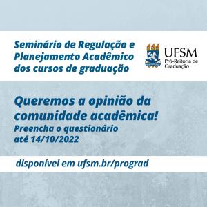O formulário segue aberto para participação até o dia 14 de outubro. As questões são derivadas do Seminário de Regulação e Planejamento Acadêmico dos Cursos de Graduação da UFSM. O evento promoveu, ao longo de 2022, encontros com as Unidades Acadêmicas do Campus Sede, bem como com os Campi fora de sede, entidades estudantis e sindicais, além de audiências públicas com as comunidades dos municípios de Cachoeira do Sul, Frederico Westphalen, Palmeira das Missões e Santa Maria.
