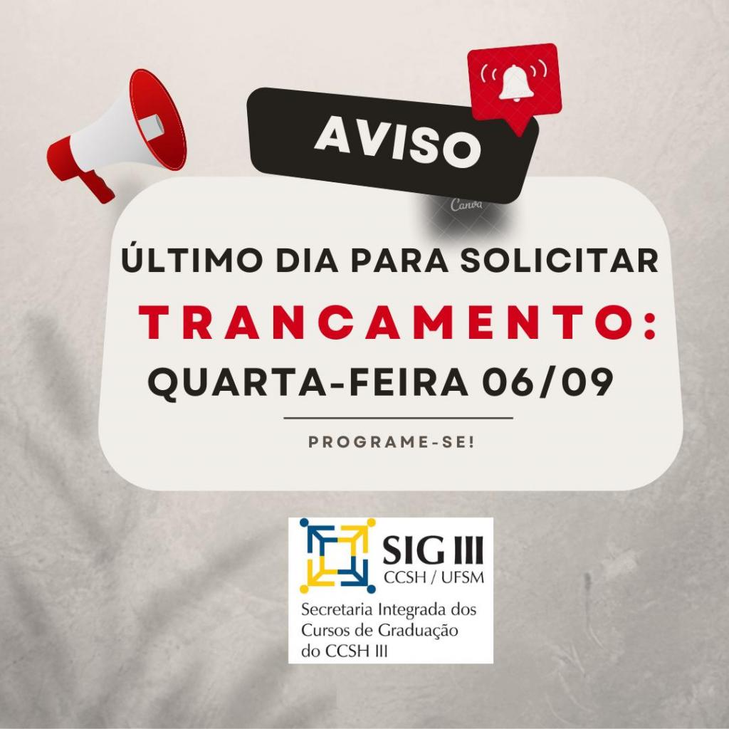 Conforme calendário acadêmico da UFSM, quarta-feira (06/09) é a data-limite para solicitar trancamento no seu curso.