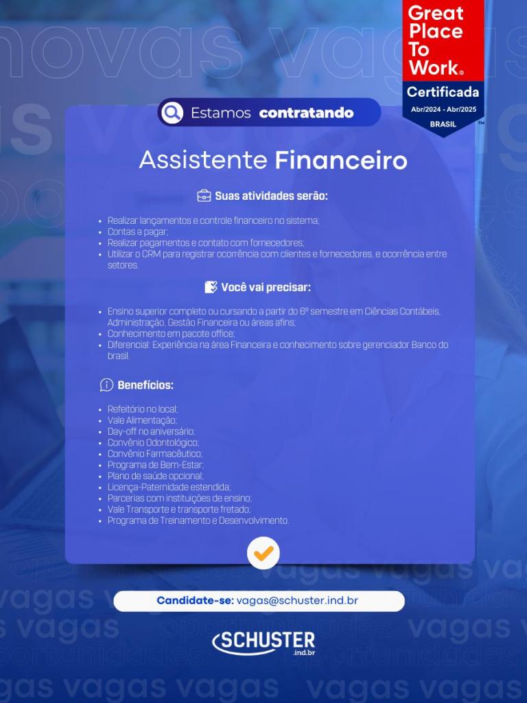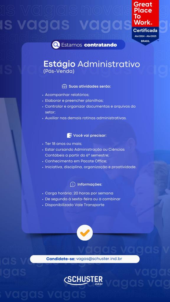 A Schuster Equipamentos Odontológicos divulga oportunidades de estágio e vagas efetivas. Informações nos cards, em anexo.