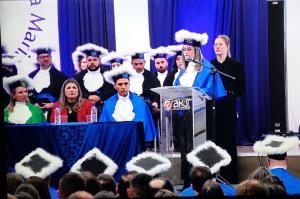 Após a exibição do vídeo de homenagem aos pais, familiares, amigos e amores, encerrando com chave de ouro a solenidade, a Paraninfa da Turma, Professora Flavia Luciane Scherer, exaltou em seu discurso a responsabilidade dos profissionais formados em serem egressos deste que é um curso da mais alta qualidade e de uma das melhores Universidades do Brasil e do mundo: Citando Aristóteles em sua fala. mencionou seu desejo que sejam virtuosos na construção de um país melhor, mais justo e menos desigual. E inspirados pela música de Frejat, encontrem felicidade e realização em suas escolhas, de modo que tenham energia para recomeçar a cada dia sempre que a vida os desafiar. Parabéns aos mais novos Bacharéis em Administração da UFSM!