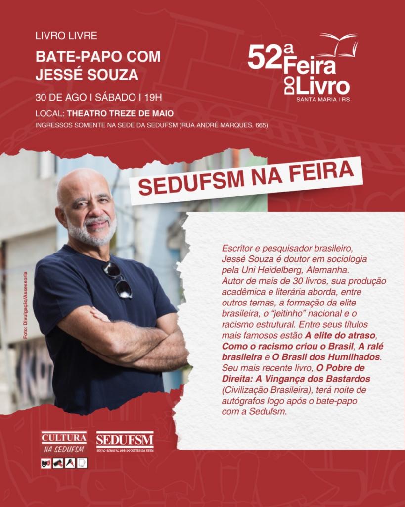 Autor de A Elite do Atraso e do recente O Pobre de Direita, o sociólogo e escritor Jessé Souza vem a Santa Maria para um bate-papo especial a convite da Sedufsm! A atividade ocorre dentro da programação do Livro Livre na 52ª Feira do Livro de Santa Maria e os ingressos são gratuitos e limitados. Com mais de 30 livros publicados, Jessé é referência nos debates sobre elite brasileira, racismo estrutural e política nacional. A conversa terá mediação da diretoria da Sedufsm e, logo depois, sessão de autógrafos de seu livro mais recente, O Pobre de Direita (2024).