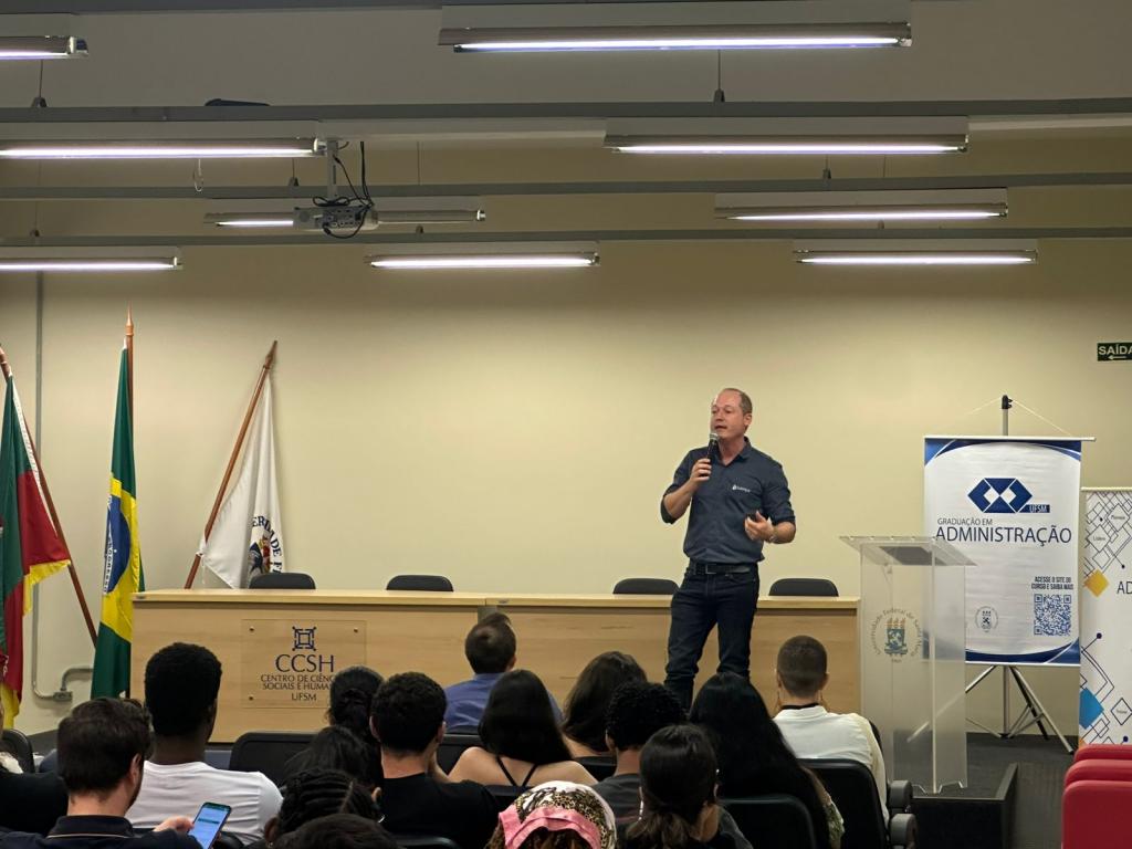 Entre os convidados, participou o administrador Fabiano Leoratto Pozobon, egresso da UFSM nos cursos de Administração e Ciências Contábeis, com especialização em Controladoria, e fundador da empresa SISLIMPA – Sistemas de Limpeza, onde atua desde 2004. Em sua fala, compartilhou aspectos de sua trajetória profissional e empresarial com os estudantes presentes.