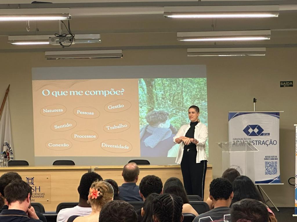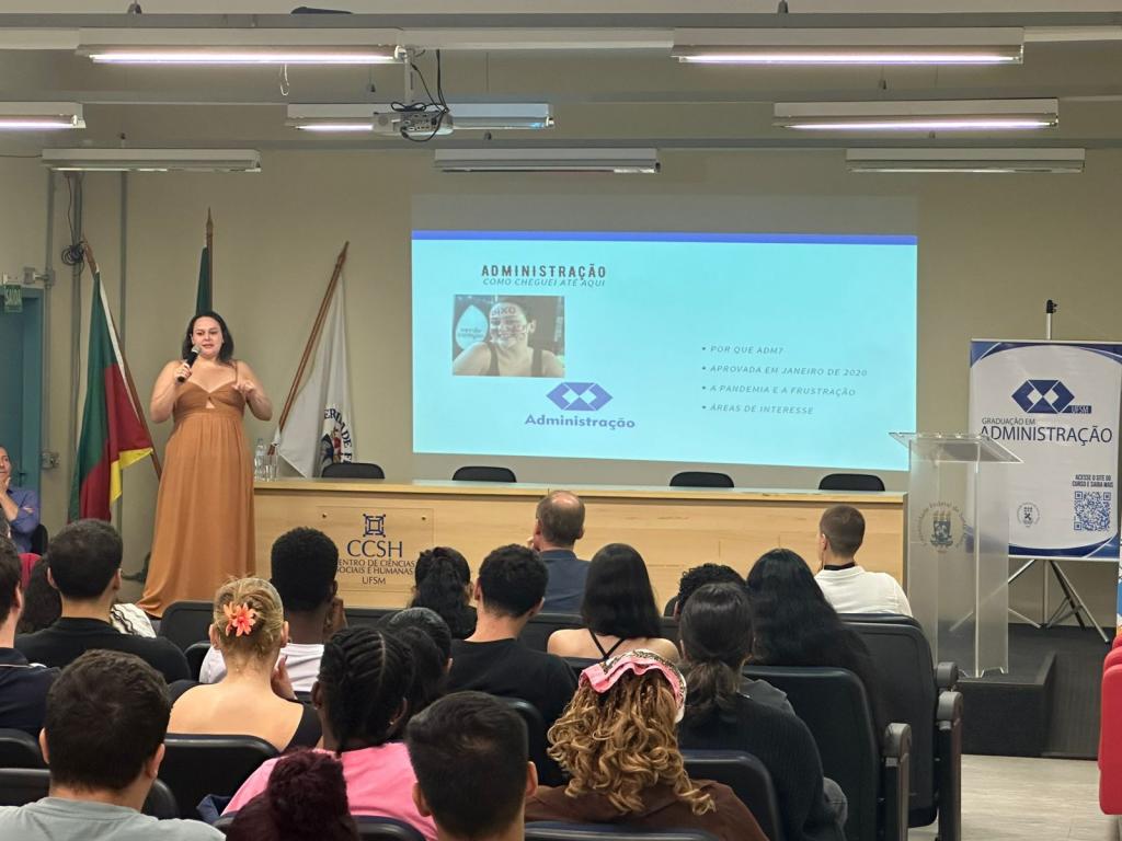 A programação contou com a saudação institucional da Prof.ª Mitieli Seixas da Silva, Vice-Diretora do Centro de Ciências Sociais e Humanas da UFSM, e do Prof. Gilnei Luiz de Moura, Chefe Substituto do Departamento de Ciências Administrativas. Também foi registrada a presença do Prof. Juliano Nunes Alves, Coordenador do Curso de Administração Diurno, da Prof.ª Ranice Höehr Pedrazzi Pozzer, Coordenadora do Curso de Administração Noturno, além de docentes e estudantes do curso.