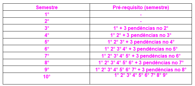 1- Para o discente matricular-se em disciplinas do 3° semestre deve ter integralizado todas as disciplinas do 1° semestre e pode ficar com até 3 (três) pendências do 2º semestre.