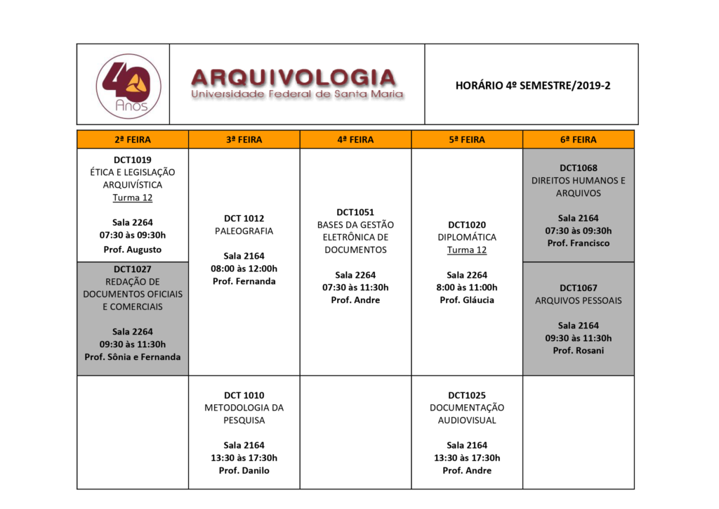 Grade de horários das disciplinas do 2º semestre de 2019.
