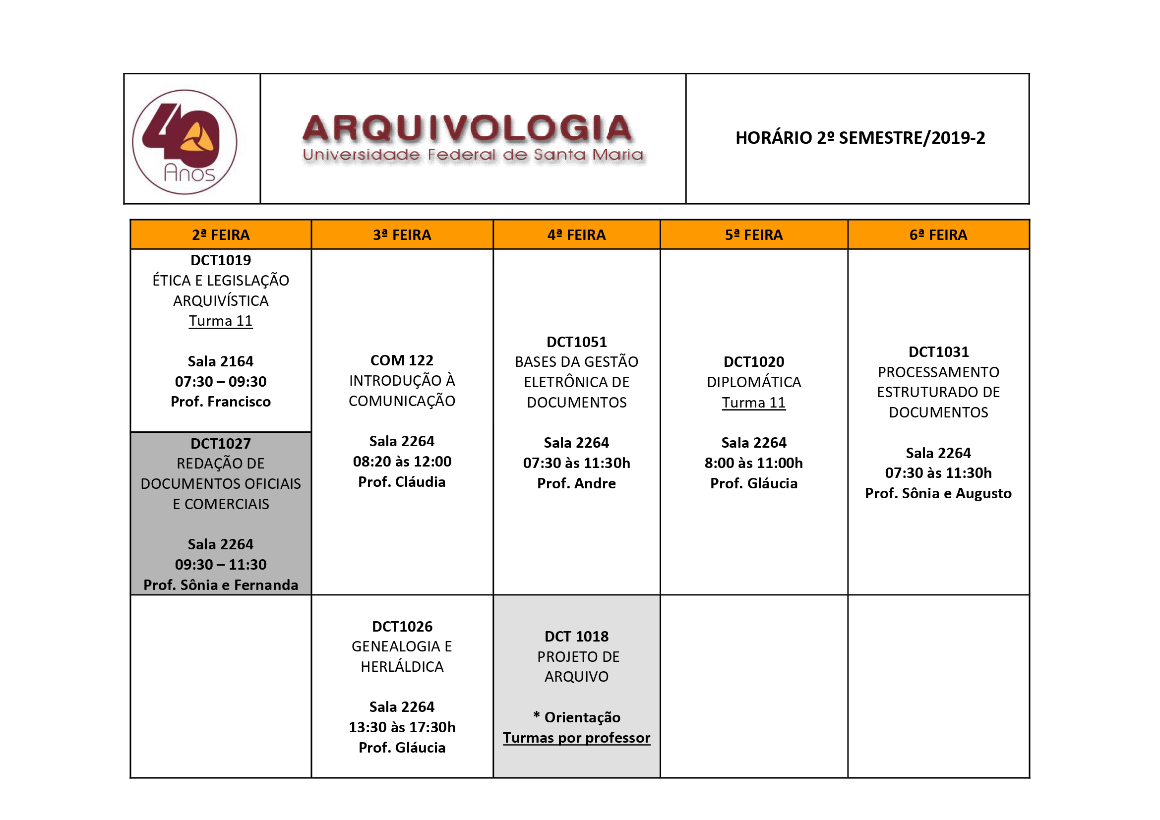 Grade de Horários 2º Semestre de 2019.