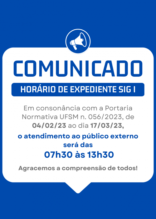 A Secretaria Integrada de Graduação I (74A), informa que, de acordo com a Portaria Normativa Nº 56 de 19 de janeiro de 2023 e em consonância com as orientações da Direção do CCSH, de 04 de fevereiro a 17 de março, o horário de atendimento ao público externo será das 07h30 às 13h30, exceto no dia 22 de fevereiro de 2023 (quarta-feira de cinzas), quando o expediente ocorrerá no horário das 14h às 18h.