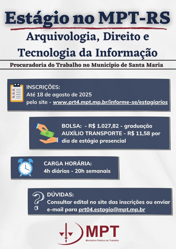 O Ministério Público do Trabalho no Rio Grande do Sul está com inscrições abertas para o Processo Seletivo 2025.1 de estagiários para a Procuradoria do Trabalho no Município de Santa Maria/RS.