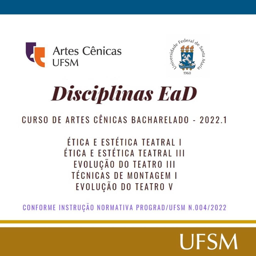 Conforme a Instrução Normativa PROGRAD/UFSM N. 004/2022, o Curso de Artes Cênicas Bacharelado informa que as seguintes disciplinas serão ofertadas na modalidade de Ensino à Distância – EaD em 2022.1: