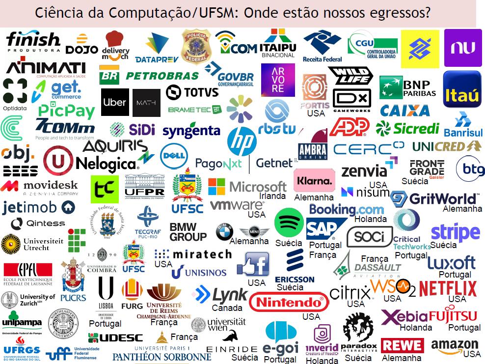 Um levantamento recente, liderado pela Professora Marcia Pasin, identificou as empresas e instituições de nossos egressos (confira na imagem abaixo). Além disso, o curso mantém um percentual de empregabilidade extremamente alto, sendo que quase 100% de nossos egressos estão, ou estiveram recentemente, trabalhando na área, seja na indústria, na academia ou mesmo cursando pós-graduação.