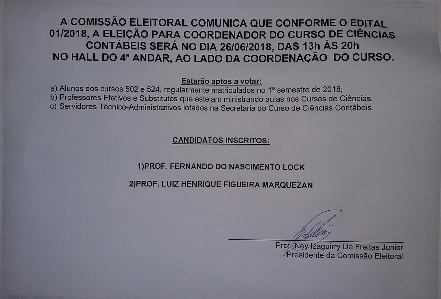 Retificamos, que o horário de início da votação, conforme edital 001/2018 da Comissão Eleitoral, é às 14h.