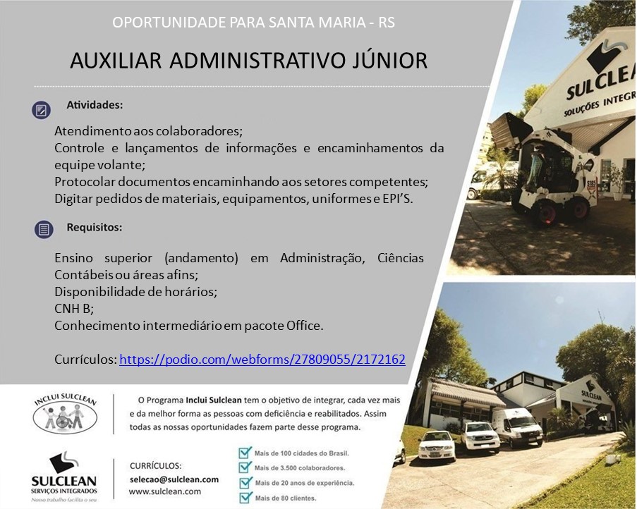 Oportunidade Sulclean – Auxiliar Administrativo Júnior