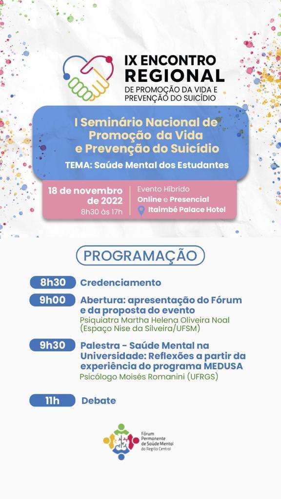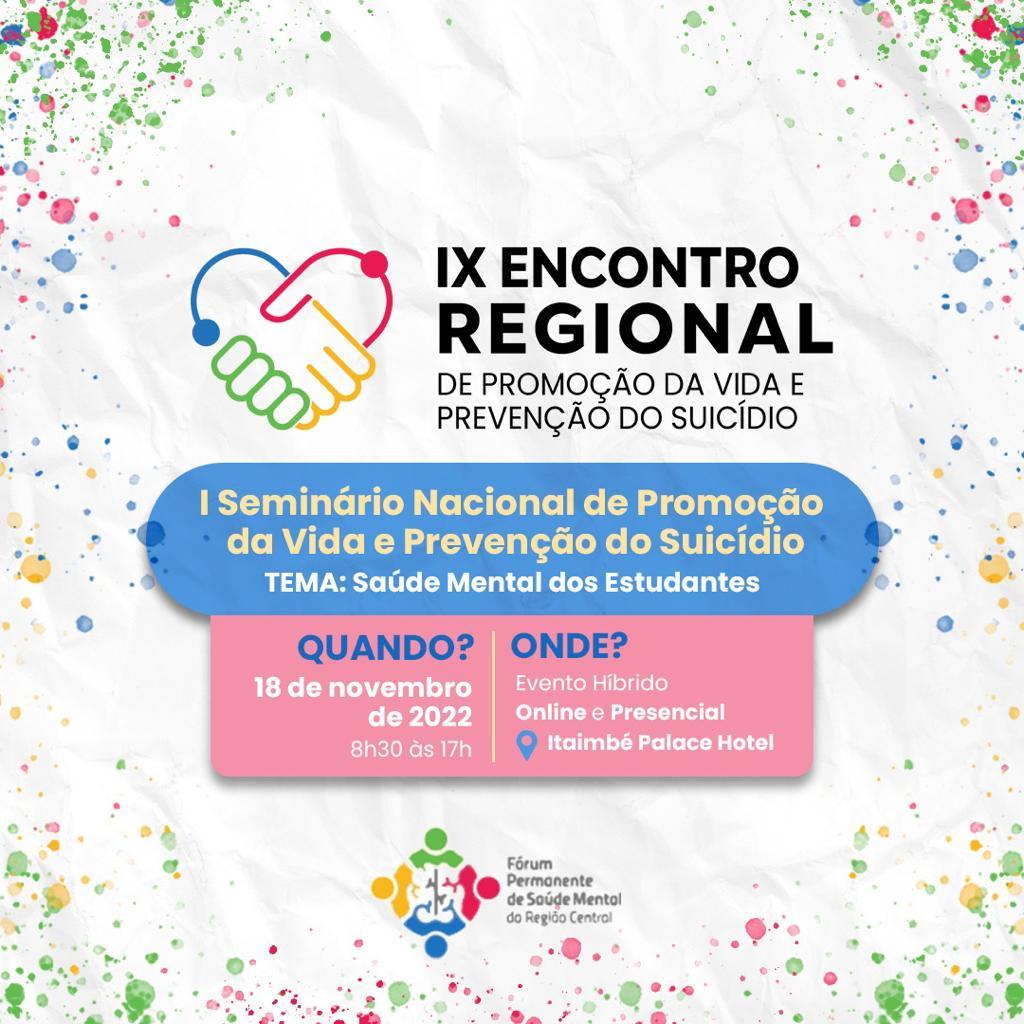 Na próxima sexta-feira, dia 18 de novembro, acontecerá o IX Encontro Regional de Promoção a Vida e Prevenção ao Suicídio e o I Seminário Nacional de Promoção da Vida e Prevenção do Suicídio, no Hotel Itaimbé Palace, das 8h30 às 17h. O tema central do evento será “Saúde Mental dos Estudantes”, e além da participação presencial, será transmitido online.