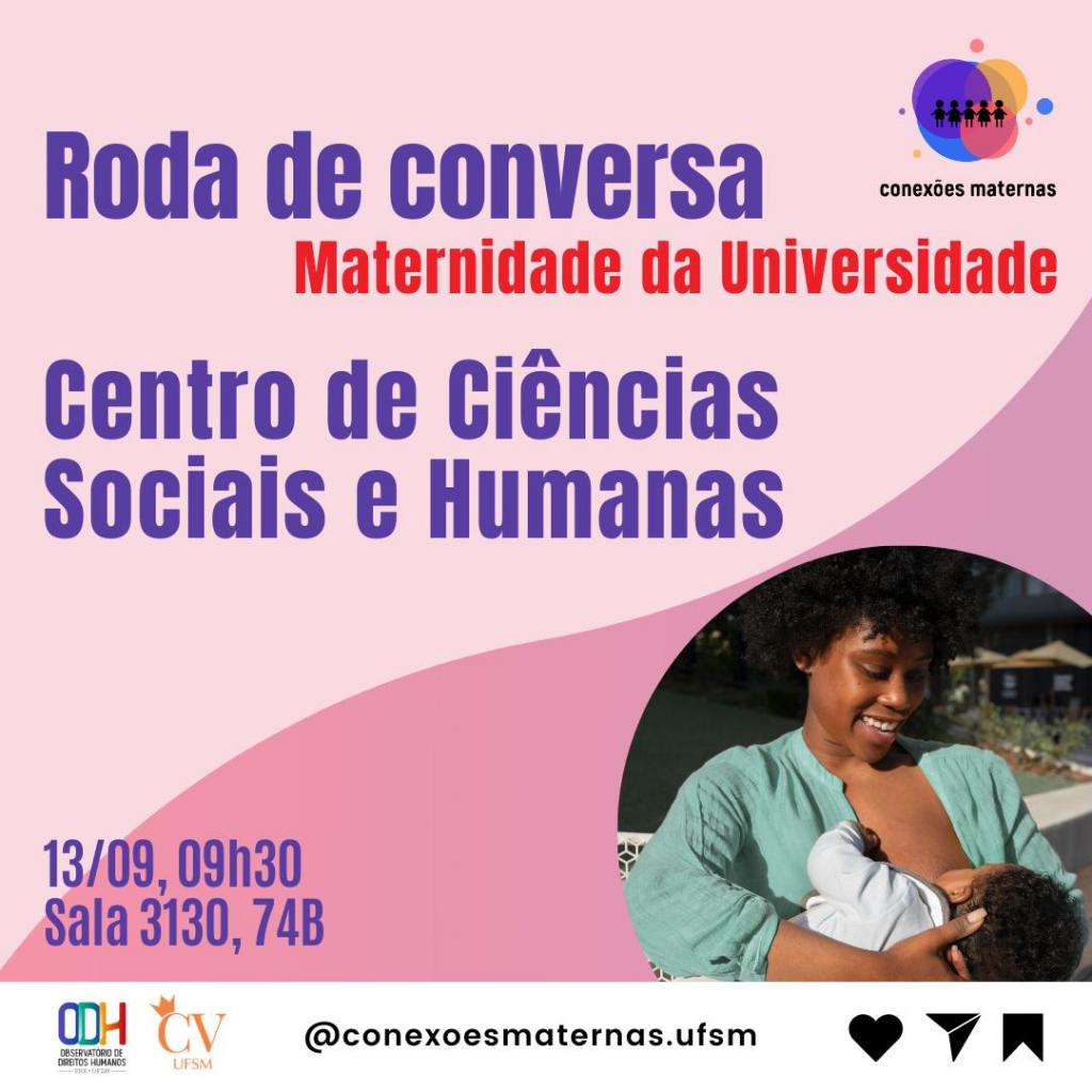 O projeto Conexões Maternas, que está em andamento desde 2023, tem o intuito de mapear e compreender as demandas das mães da comunidade acadêmica da UFSM. Em 2024, as rodas de conversa promovidas pelo projeto estão sendo realizadas por centros, tendo em vista a compreensão da realidade de cada estudante e servidora de forma mais próxima. O primeiro encontro de 2024/2 será no Centro de Ciências Sociais e Humanas, no dia 13 de setembro, a partir das 9h30, sala 3130 do prédio 74B.