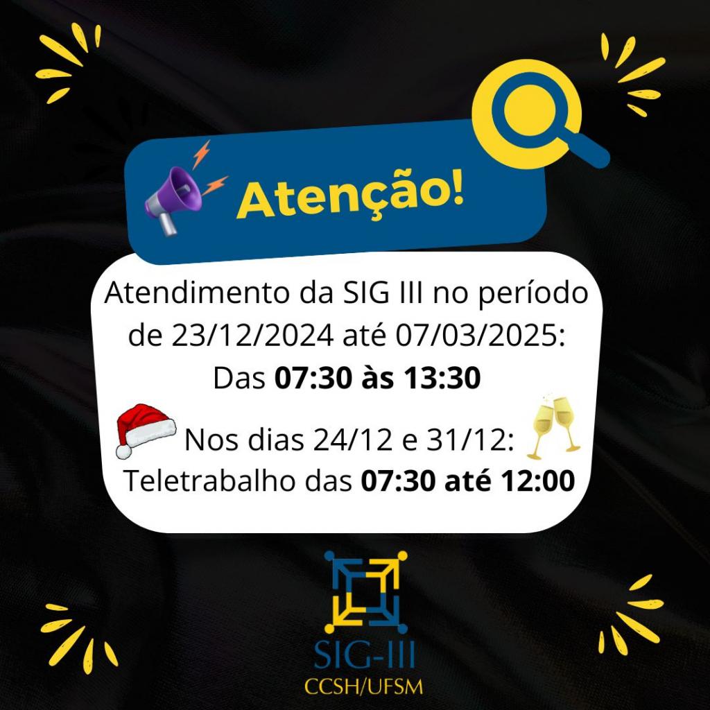 A Secretaria Integrada de Graduação III informa que no período de 23 de dezembro até 07 de março de 2025, estará com horário de atendimento reduzido, das 07:30h até 13:30h.