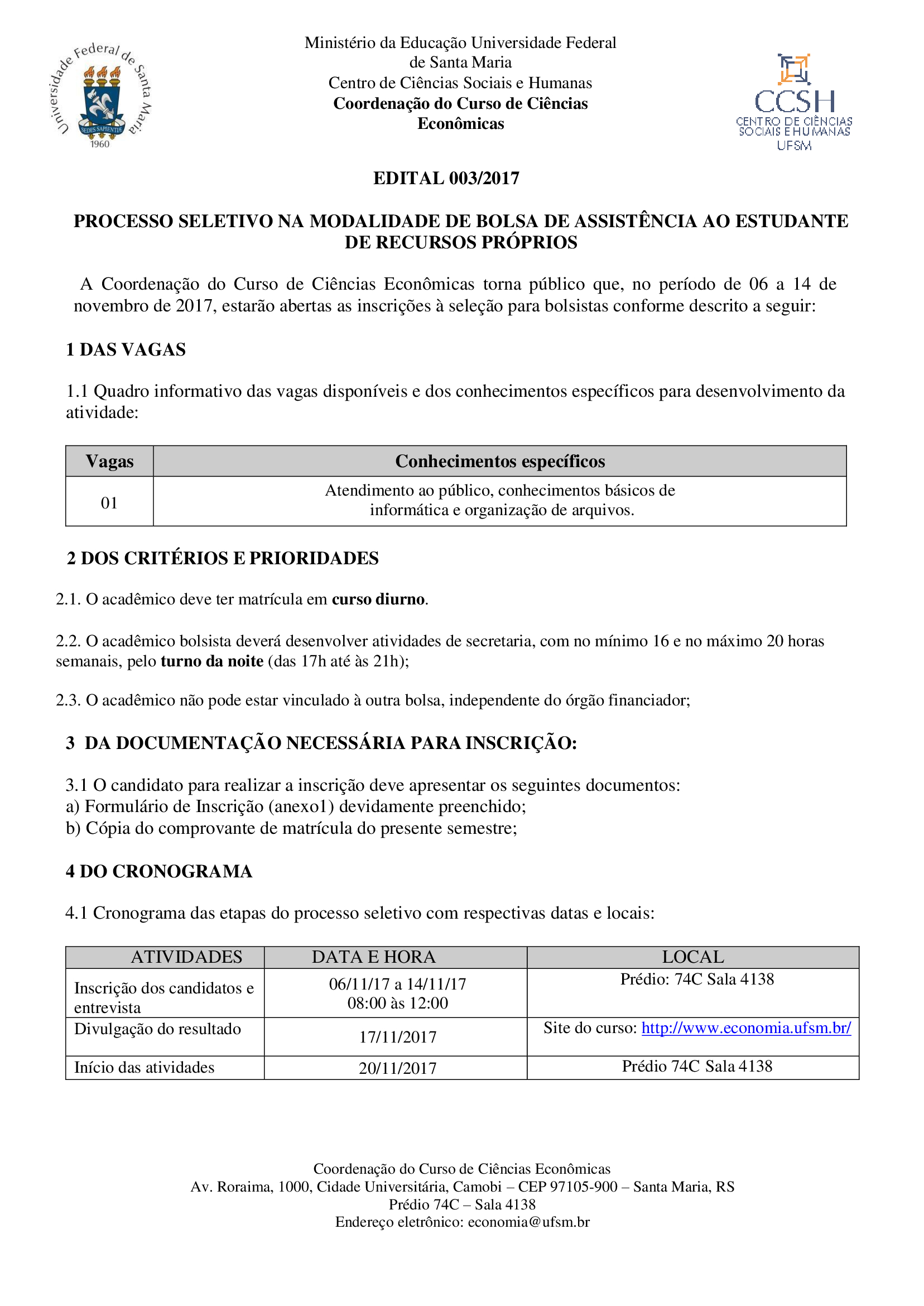 A Secretaria da Coordenação do curso de Ciências Econômicas torna público o edital º003//2017 de seleção para Bolsista.