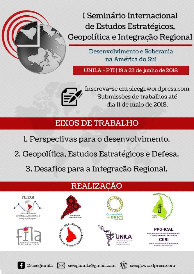O Núcleo de Estudos Estratégicos, Geopolítica e Integração (NEEGI) da Universidade Federal da Integração Latino-Americana (UNILA) tem o prazer de divulgar o “I Seminário Internacional de Estudos Estratégicos, Geopolítica e Integração Regional” (I SIEEGI).