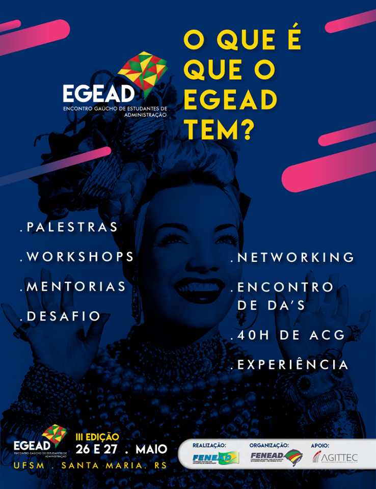 A terceira edição do Encontro Gaúcho de Estudantes de Administração conta com o tema “Desafio EGEAD, do que você é capaz em #dois dias?” e traz uma programação com workshops e palestras ministrados por grandes nomes do empreendedorismo e Startups, donos de diversos cases de sucesso. O desafio se baseia em dividir os congressistas em times que deverão, através de suas capacidades e a ajuda da mentoria do evento, trazer ideias inovadoras e viáveis de soluções para a sociedade, além de conquistarem os juízes ao defenderem suas propostas.