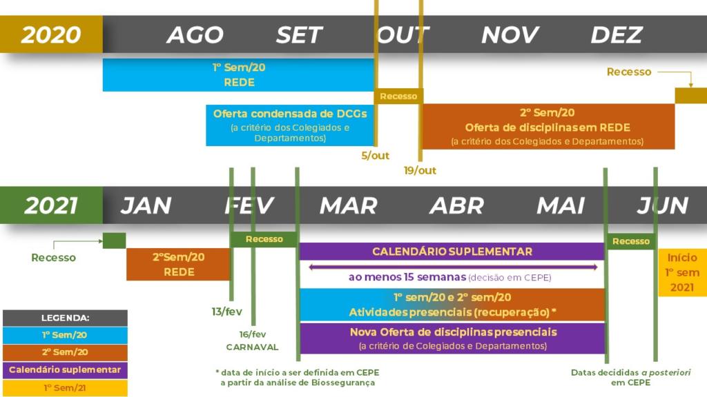 As atividades do primeiro semestre de 2020, cuja adesão ao Rede foi facultativa tanto de docentes quanto para estudantes, poderão ser recuperadas posteriormente, com a definição de um Calendário Suplementar, no retorno da presencialidade.