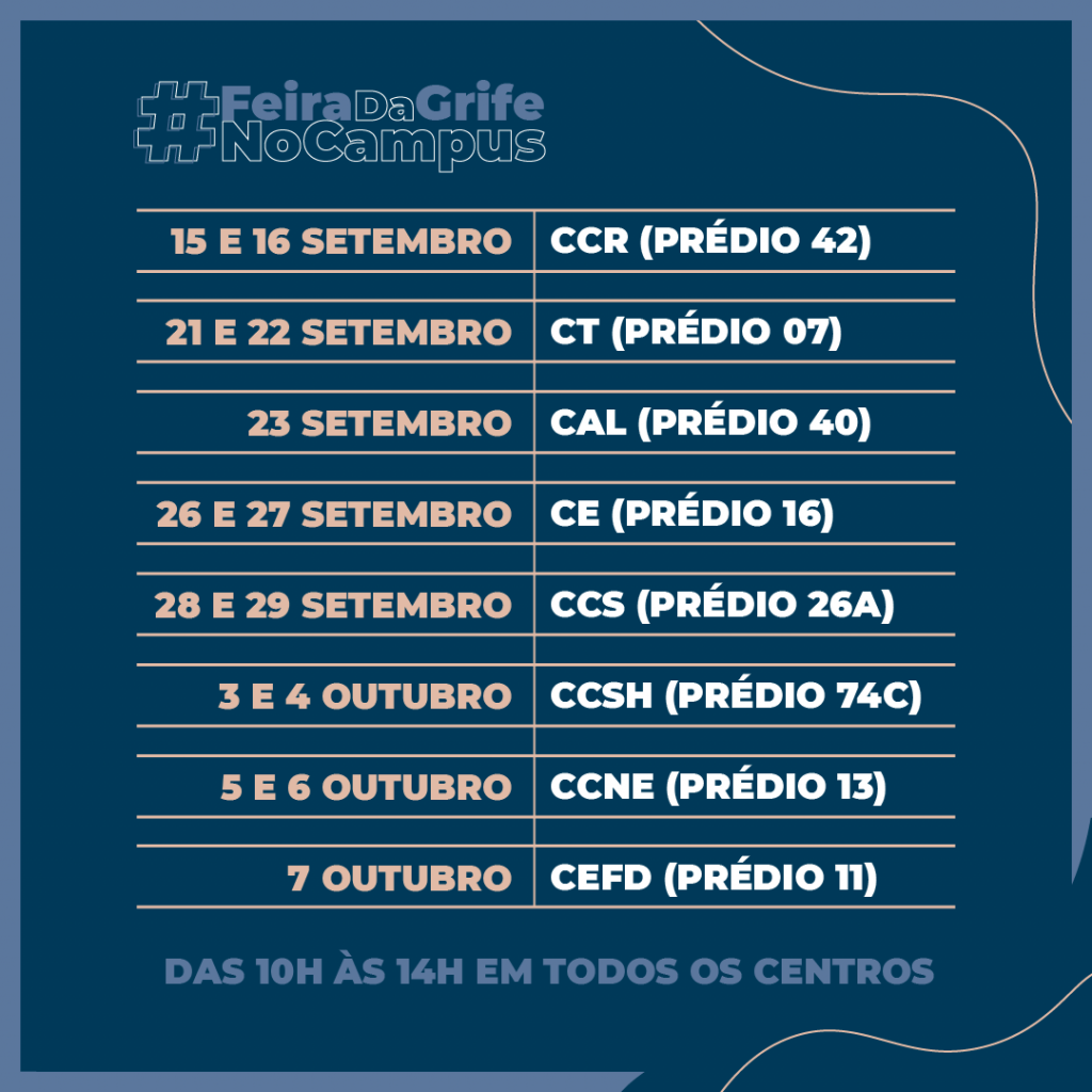 A tradicional Feira da Grife UFSM está de volta! Para comemorar o início do semestre, a Feira teve início no dia 15 de setembro e se estenderá até o dia 7 de outubro, abrangendo todos os centros da UFSM campus Camobi, com os produtos da Grife.
