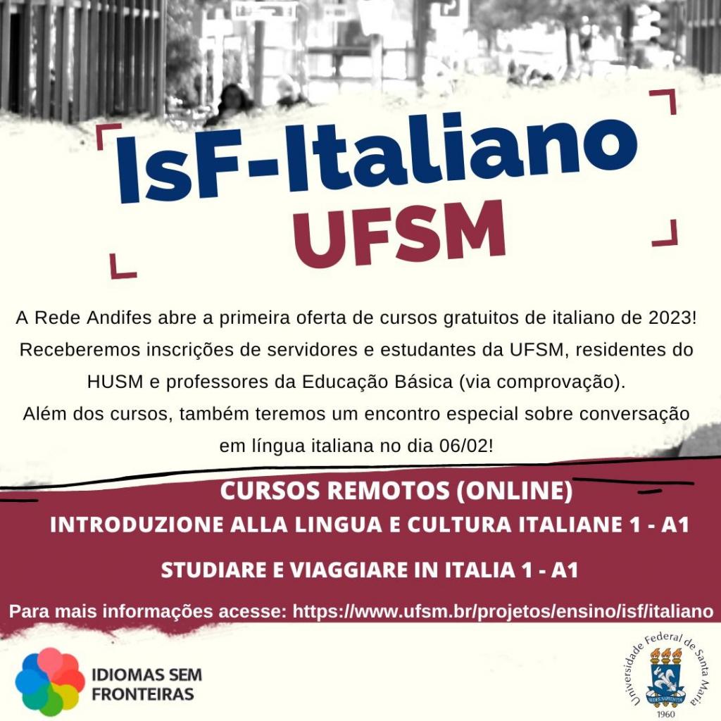 O Programa Idiomas sem Fronteiras, no âmbito da Rede Andifes IsF, através do Núcleo de Línguas convida toda a comunidade acadêmica da UFSM (servidores e estudantes da UFSM, residentes do HUSM e professores da Educação Básica de Santa Maria e região da Quarta Colônia para participar da nossa da primeira oferta cursos de italiano de 2023.